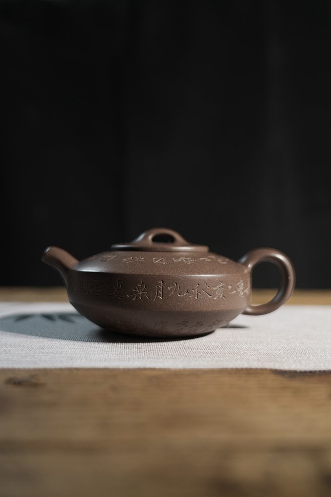 朱老师以原矿青灰泥手制此扁石壶,式承曼生遗韵,胎薄工精。壶身镌刻文人铭款,大拙若巧,于简练中见深意,既是实用利器,亦具金石风骨。