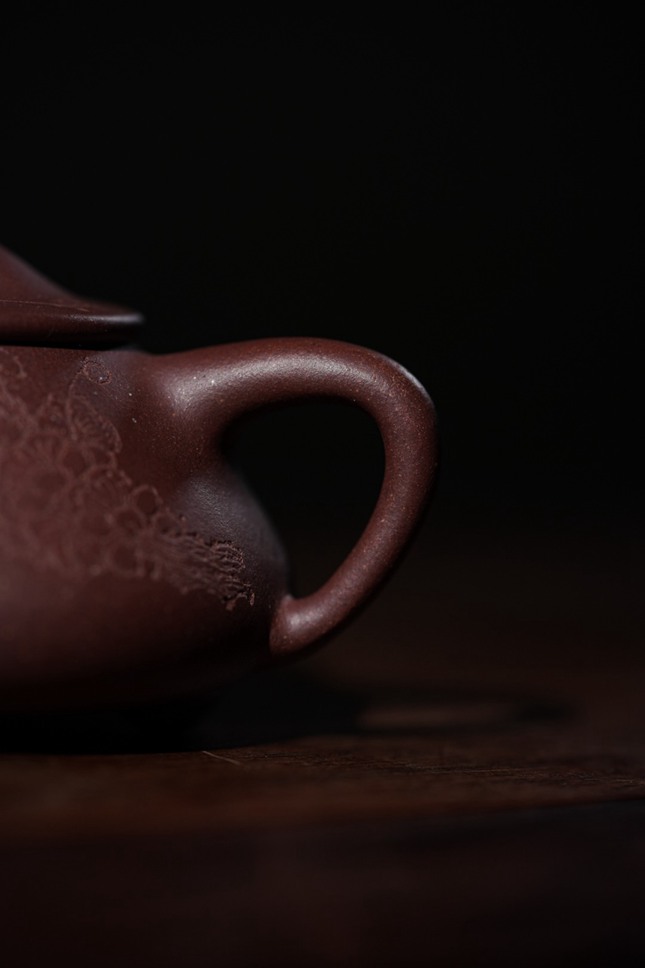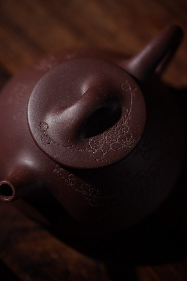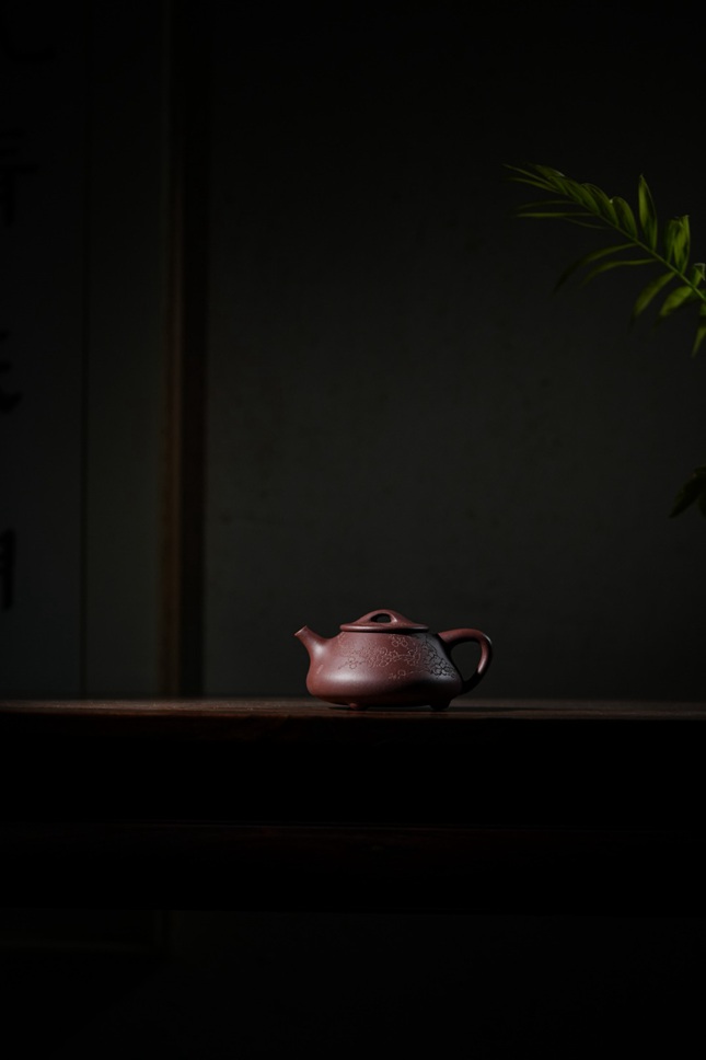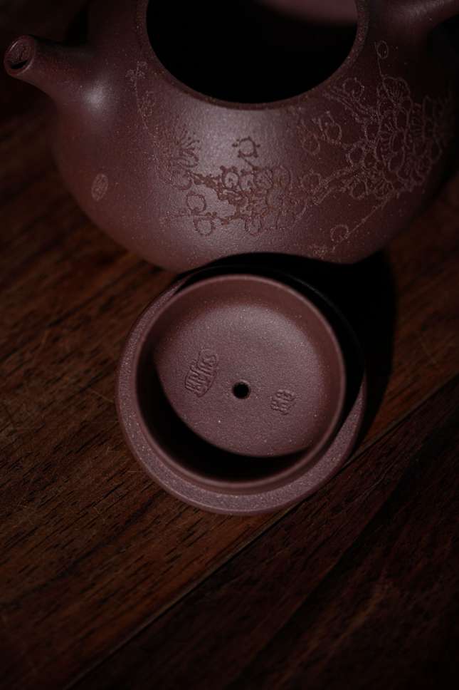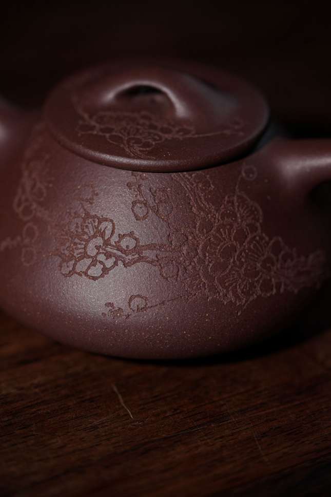 灯下观此壶,刻绘纹理在暖光里起伏流转,恍若梅枝在夜色中舒展筋骨。当沸水注入的刹那,不只是一场茶与器的交融,更是一次与古意的隔空对话——壶身每一道刀痕都保留着手工的温度,让紫砂的朴拙与梅魂的清雅在茶汤中达成微妙平衡。