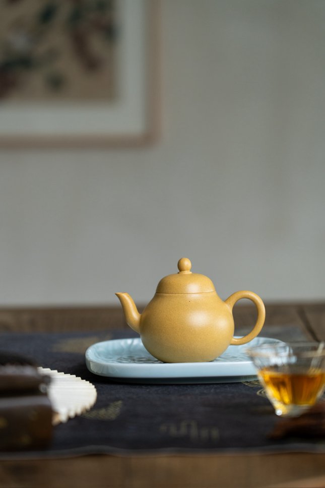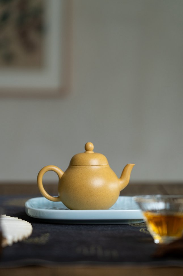 这把梨形壶,以原矿本山绿泥抟制,125cc的袖珍体量,却蕴藏着充盈的气韵。泥色呈青中泛黄之调,若初春新叶,温润含光。壶身取秋梨之形,饱满圆融,自壶盖至壶底一气呵成,线条流转间不见滞涩。宝珠钮精巧玲珑,弯流柔婉胥出,圈把圆润称手,三者在稳实的壶体上各安其位,却又彼此呼应,整体看去,恰似一尊端坐的弥勒,沉稳而含喜意。