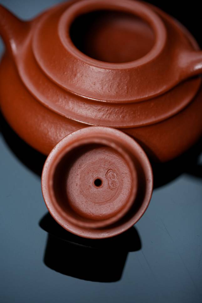 实力派艺人董俊峰所制的朱泥石瓢壶,容量115CC,以全手工古法盘筑法精制,师承冯伯明,更得省大师范洪泉指点,工艺根基深厚。此壶选朱泥朱砂为料,色泽温润红润,泥料颗粒肌理细腻,经火淬炼后,光线下若隐若现,粗粝中藏着温润质感,满是手作独有的温度。摒弃机械辅助,以层层盘叠之法塑器,每一道纹理都是指尖力道的沉淀,尽显传统紫砂技艺的纯粹与精妙。