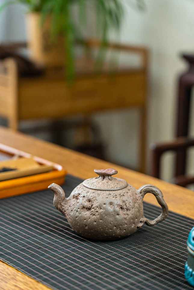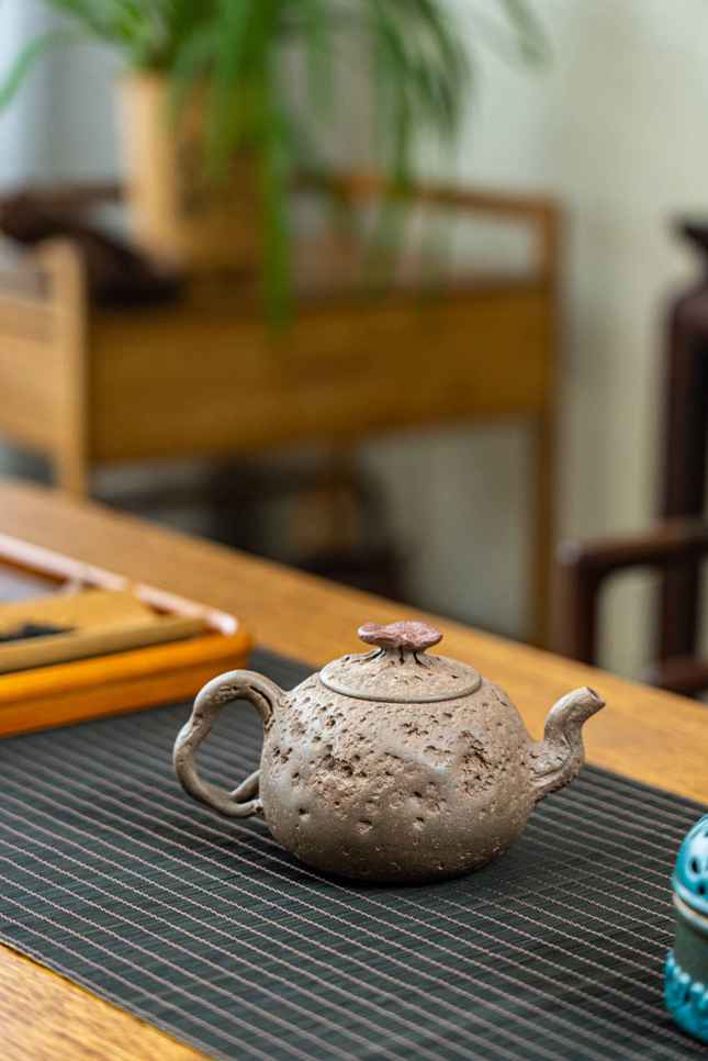 壶身延续传统供春的古朴韵味,仿老树疙瘩的肌理自然灵动,却暗藏规律,区别于传统供春的随性野趣,更显匠心巧思。壶把与壶嘴纤细对称,线条流畅利落,搭配灵芝造型壶钮,既赋予器物吉祥寓意,又形成独特标识,打破传统供春的同质化局限。薄胎工艺的运用,更凸显李老师深厚的制壶功底,器身仿树皮褶皱细腻逼真,整体浑圆敦厚、古雅拙朴,兼具历史底蕴与创新巧思,实为一款赏用皆宜的紫砂佳作。