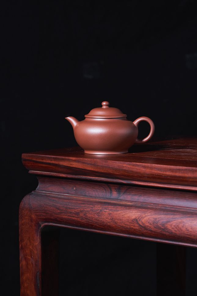 壶型承袭莲子经典神韵,却藏有匠人的巧思打磨。身筒弧度饱满丰盈,无丝毫生硬之感,壶肩过渡圆滑自然,衔接流畅无痕;流把对称协调,线条舒展有力,自带十足张力,执握舒适贴合。口盖线圆润精细,严丝合缝,颈项与壶身骨肉匀称,尽显樸拙浑厚之气。顶盖上的宝珠钮小巧灵动,点睛之笔般增添神韵,整体造型古朴雅致,搭配和谐,将自然意趣与手工温度完美融合,既有传统器型的韵味,又有独特的匠人质感。