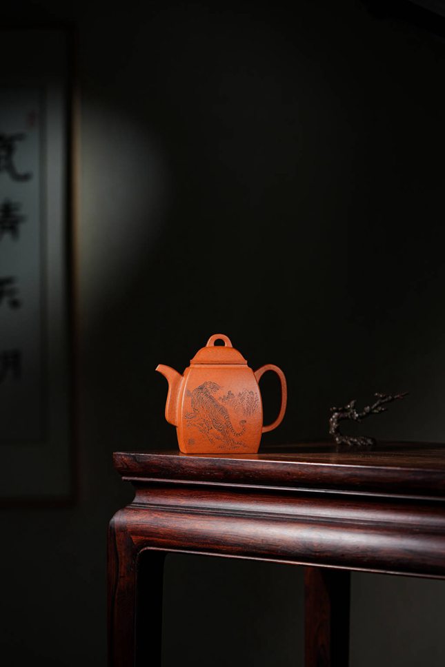 此壶为汉方壶,由蒋老师倾心打造,选用宜兴经典降坡泥制成,容量450cc,兼具实用与审美价值。降坡泥作为紫泥、红泥、段泥的共生矿,砂感温润,色泽呈温润的橘红调,颗粒层次丰富,透气性极佳,既能凸显茶汤醇和口感,又极易养出温润包浆,上手质感细腻而不滑腻,尽显古朴韵味。