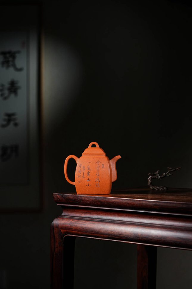 汉方壶的形制溯源至明代,灵感源自汉代青铜方瓶,却不刻意复刻古器,更显当代匠人心思。壶身呈高四方造型,四棱经圆化处理,刚正之中藏着柔和弧线,避免了方器的生硬感;壶口内敛,短颈衔接笔直宽敞的腹部,利落大气。四注式壶盖搭配弧形桥式钮,扁环状把手握感舒适,细长精致的流管延伸至壶身四分之三处,出水流畅。整体造型简洁洗练、雄浑肃穆,将汉文化的端庄大气与紫砂工艺的温润质感相融,每一处细节都彰显着匠人的精湛技艺与对传统文化的敬畏。