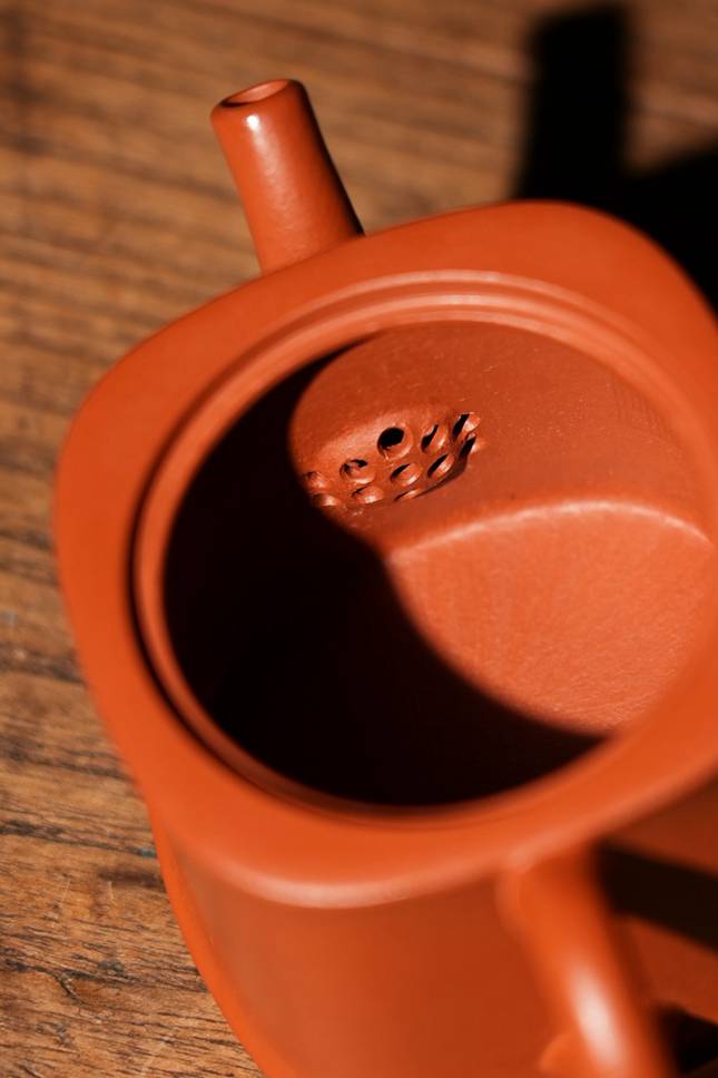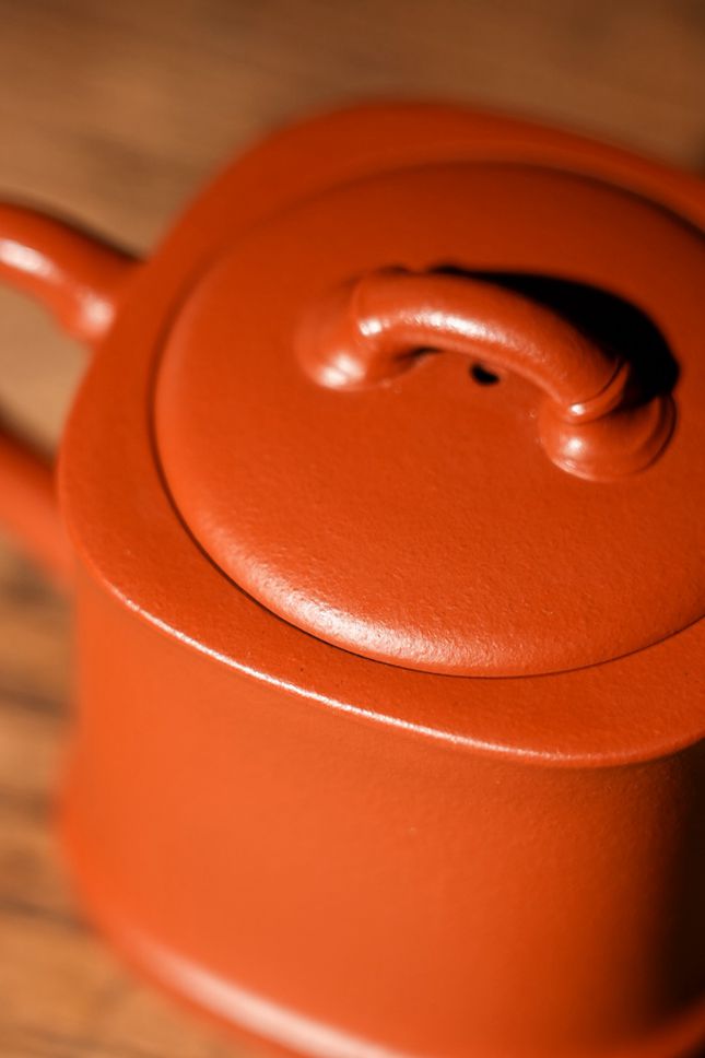 甄选优质朱泥,胎质细腻致密,色泽温润红润,无浮华艳色,自带古朴质感。朱泥透气性佳,能最大程度锁住茶香,经长期茶汤滋养,包浆渐生,色泽愈发莹润,泥香与茶香交融,愈显韵味。壶底钤印工整有力,刀工娴熟,方寸之间尽显董俊峰的篆刻功底与制壶法度,每一处细节都藏着匠人的严谨与用心。
