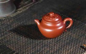 此拍品古朴素雅,壶体鼓腹若缶,弯流圈把,笠帽式壶盖与壶体结合得当,盖面塑如意纹,富有憨态意趣。上好朱泥抟制,瀹…
