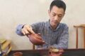 尹老师以蟹黄段泥所制“汉棠石瓢”,壶身刻绘“墨淡野云轻”山水意境,刀笔雄峻而气韵生动。作品融传统石瓢之刚健骨架…