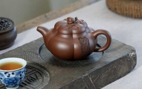 《上合桃》壶以黄龙山紫泥制成,壶身作五瓣筋纹,饱满匀称。盖钮捏塑小桃与叶,生动精巧。整壶工法严谨,寓意长寿吉祥…